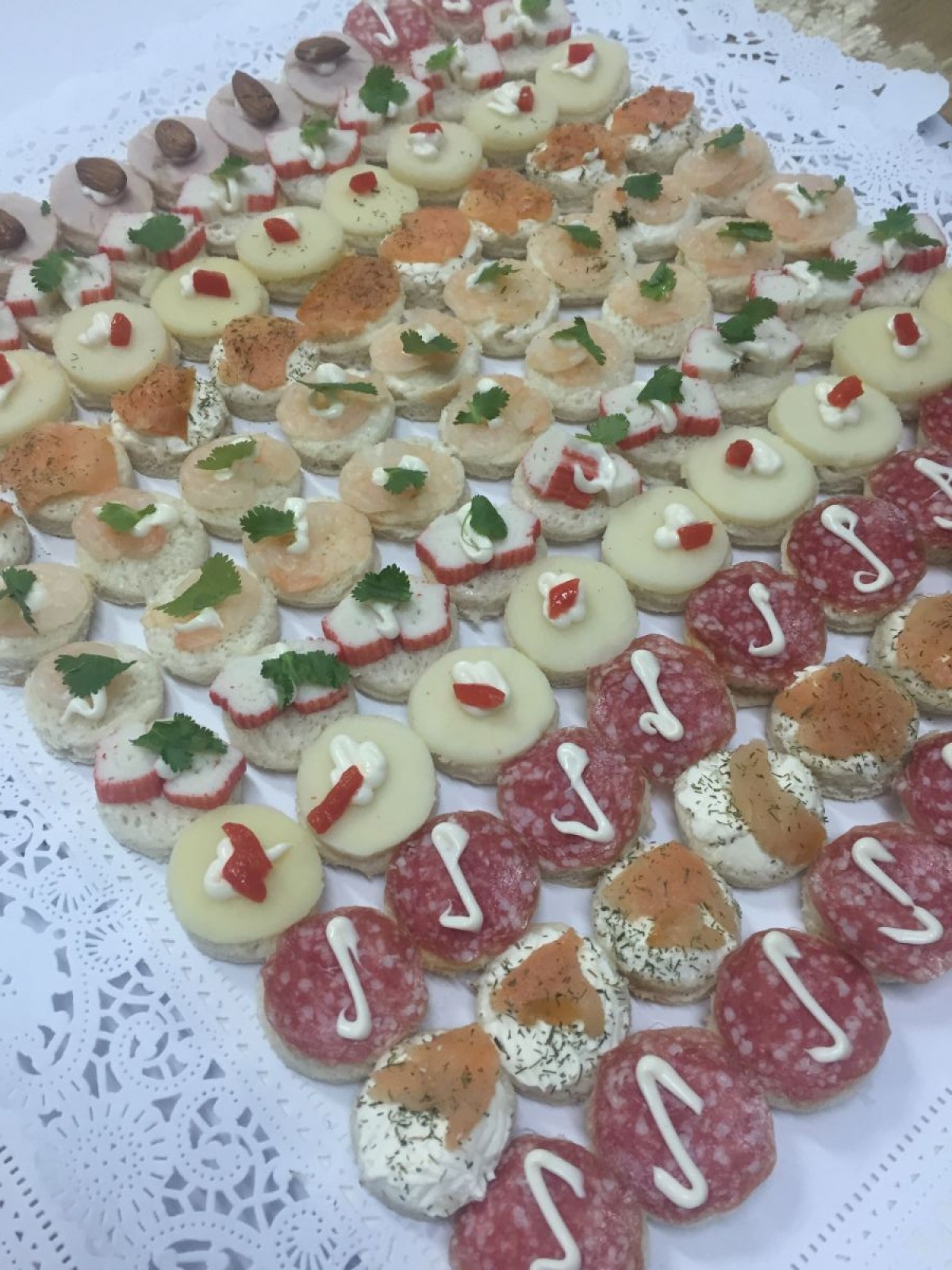 100 canapé especial 9500$ camarón, centolla, salmón, salame con cibole, palmito con cibole.